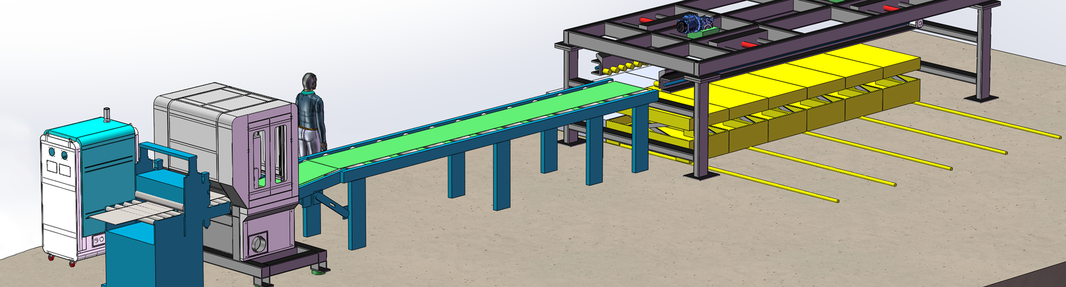 Floor rollers, pallet discharge to both sides. Stacking height 400-500 mm.